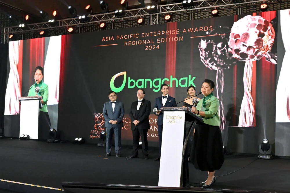 Bangchak Corporation Public Company Limited has been honored with the Asia Pacific Enterprise Awards (APEA) 2024 in the "Inspirational Brand Award" category within the Oil and Gas industry. The Bangchak brand was recognized for its exemplary image and philosophy that serves as an inspiration to others, thanks to its growth in tandem with social and environmental responsibility. The award was received by Mrs. Gloyta Nathalang, Senior Executive Vice President of Sustainability Management and Corporate Communication, at the event held at Bangkok Marriott Hotel the Surawongse.