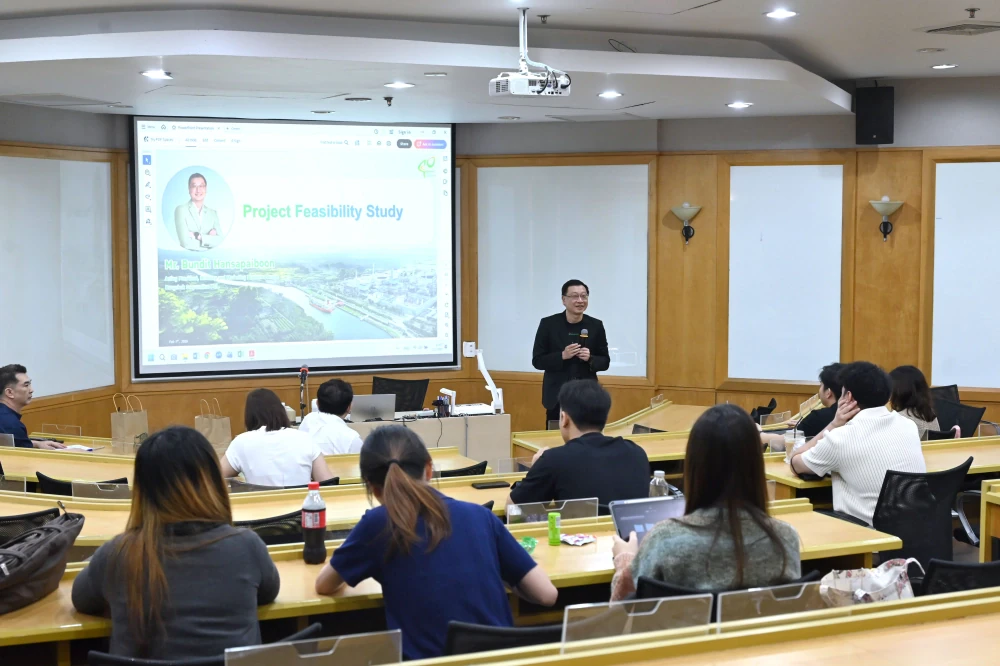 In addition, Mr. Bundit explained that the key to a project feasibility study lies in analyzing critical factors such as marketing, finance, technology, legal considerations, and resources, coupled with risk assessment and SWOT analysis to prioritize decisions before investment. These measures help navigate uncertainties, generate returns, and deliver value across the entire chain of products and services to customers. He stressed the importance of modern leadership in understanding organizational goals and customer needs, and in continuously adapting to new opportunities. He concluded his lecture by highlighting the value of intergenerational knowledge sharing, noting that the more we give, the more we receive, and that this knowledge can be passed on endlessly to support sustainable development.