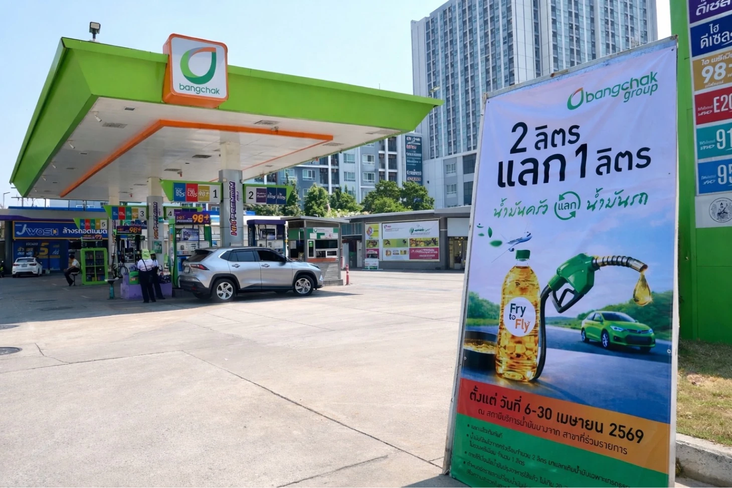 ในช่วงที่ราคาพลังงานยังคงผันผวนจากสถานการณ์ในตะวันออกกลาง ซึ่งส่งผลต่อค่าครองชีพของผู้บริโภคโดยตรง บริษัท บางจาก คอร์ปอเรชั่น จำกัด (มหาชน) จึงริเริ่มโครงการ “Fry to Fly - 2 ลิตร แลก 1 ลิตร” ภายใต้แนวคิด “น้ำมันครัว แลก น้ำมันรถ” ชวนทุกครัวเรือนนำน้ำมันปรุงอาหารใช้แล้วมาแลกเป็นน้ำมันเชื้อเพลิงสำหรับยานยนต์ ในอัตรา 2 ลิตร ต่อ 1 ลิตร เพื่อช่วยแบ่งเบาภาระค่าใช้จ่ายในชีวิตประจำวัน โดยนำร่องผ่านสถานีบริการน้ำมันบางจากในพื้นที่กรุงเทพฯ และปริมณฑล